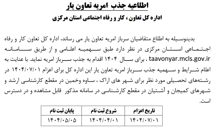 اطلاعیه جذب امریه تعاون یار ۱۱ تیر ۱۴۰۴ | ۱۲:۰۴ کد : ۵۲۷۴۸ اطلاعیه ارسال به دیگران نام شما ایمیل شما ایمیل دریافتکننده ارسال انصراف تعداد بازدید:۱۲۵۷ اطلاعیه جذب امریه تعاون یار